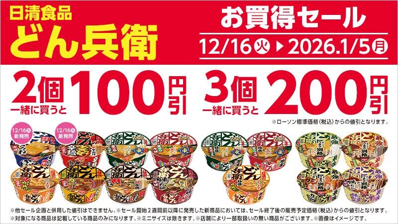 12月16日から26年1月5日までの期間、対象の日清どん兵衛を2個一緒に購入すると100円引き、3個一緒に購入すると200円引きになります。