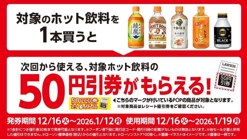 12月16日から26年1月12日までの期間、対象のホット飲料を購入すると、次回使える50円引きクーポンがもらえます。