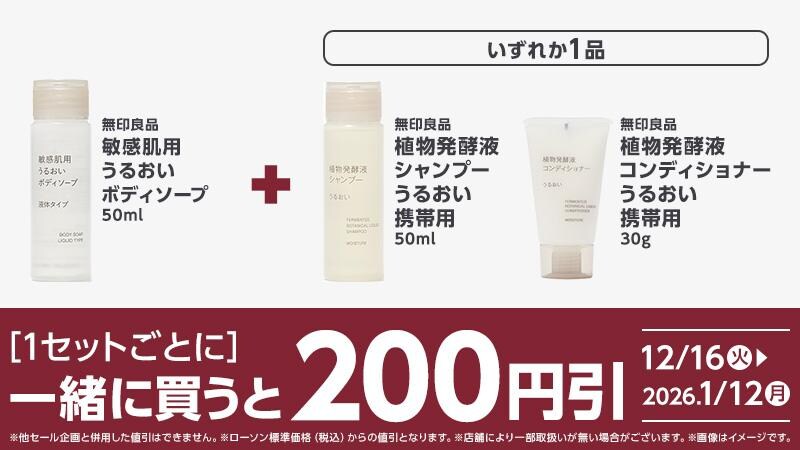 12月16日から26年1月12日までの期間、「無印良品 敏感肌用うるおいボディソープ」(50ml)と、無印良品「植物発酵液」のシャンプー(50ml)またはコンディショナー(30g)をまとめて購入すると、1セットごとに200円引きになります。