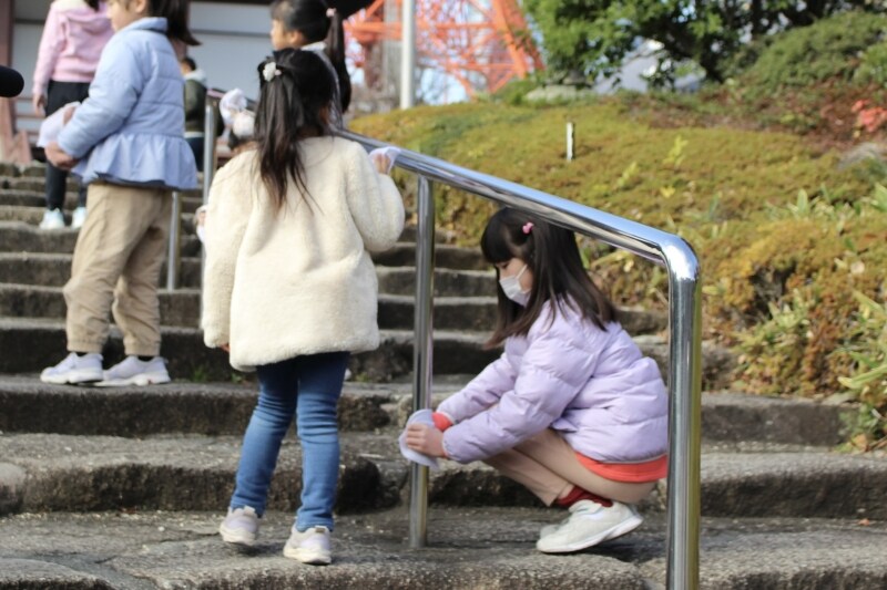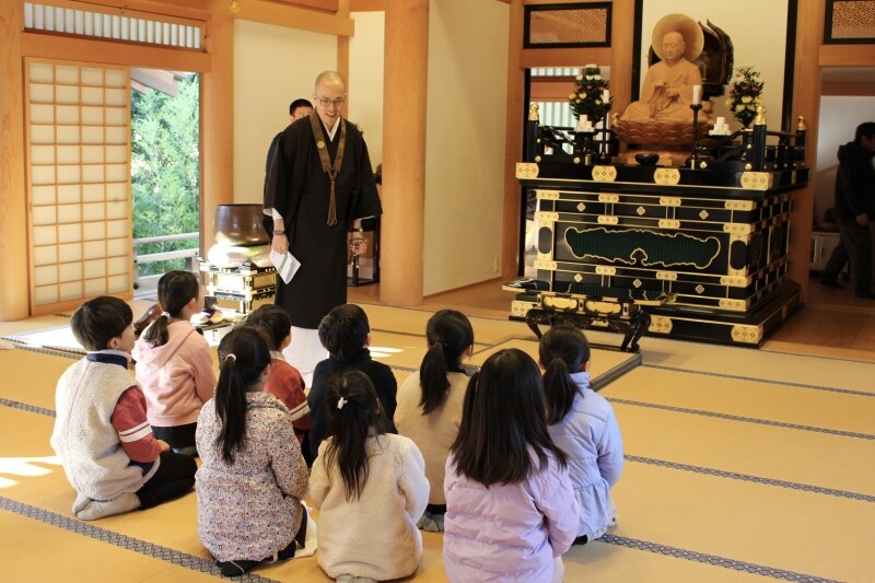 掃除の合間には、僧侶によるお話の時間や一緒に念仏を唱える時間も設けられました。合掌しながら「南無阿弥陀仏」と念仏を唱える体験では、僧侶が木魚や、金属製の鉦と呼ばれる法具の音でリズムをとりながら実践。「仏様とは、この世界のことがすべて分かっていて、優しく見守ってくれる存在です」「阿弥陀様は、亡くなった後に安らぎの世界へ導いてくれる仏様です」と明かし、子どもたちはうなずきながら聞き入っていました。