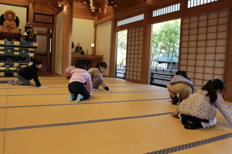 僧侶に雑巾が絞れているか確認してもらい、それぞれ担当の列の畳を丁寧に拭いていました。子どもたちは黙々と拭き掃除に取り組み、真剣な表情でした。