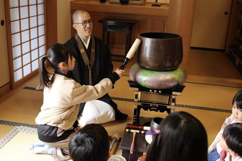 法具を打つ体験では、「やってみたい人?」という問いかけに全員が手を挙げ、順番に好きなものを選んで音を鳴らしました。