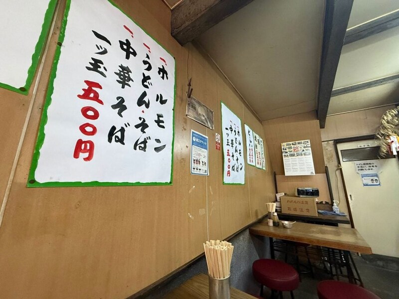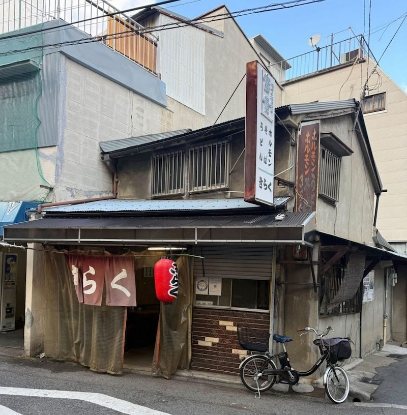 かれこれ10年以上前に初めて訪れたときの感想は「嗚呼、じゃりン子チエの世界だ……」といった感じであった。そのときに行ったお店が、有名な「きらく」。ホルモンの入ったうどんやそば、中華そばを提供している。ジョーブログさんのお店からすぐの場所にある。