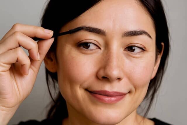 最後に取り入れたいのが「眉マスカラ」。黒髪・暗髪の大人世代は、「眉のトーンを少し明るくする」だけで影がやわらぎ、顔全体の印象がふっと軽くなります。ベージュやアッシュ系をひと塗りすると、柔らかい雰囲気に寄せやすく、眉そのものが整って見える効果も。