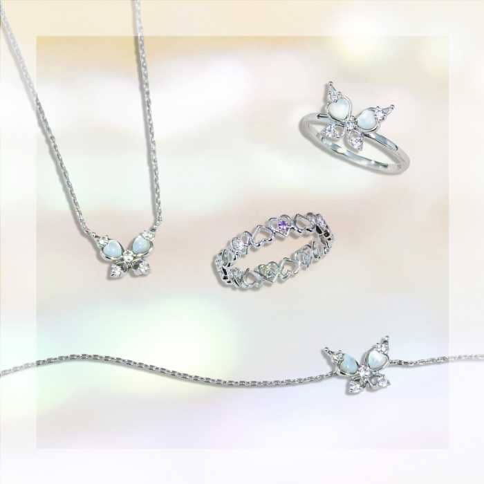 象徴的な蝶モチーフのジュエリーは、ハート型の白蝶貝を職人が一つひとつ手作業で調節し、丁寧にセッティング。
