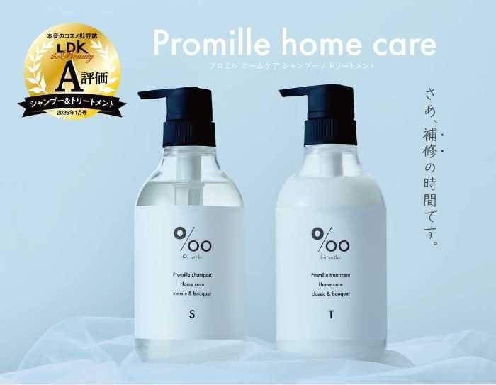 天然由来成分にこだわるPromilleのホームケアシャンプー&トリートメントが、雑誌『LDK the Beauty』2026年1月号でA評価を獲得しました♡ドン・キホーテ限定で発売中の本商品は、3種ケラチン¹・2種ラクトン²・3種プロテイン*³配合で、毎日のおうちケアでもサロン帰りのようなうるサラ髪を実現。香りはクラシックブーケで、使用するたび心地よい気分に。