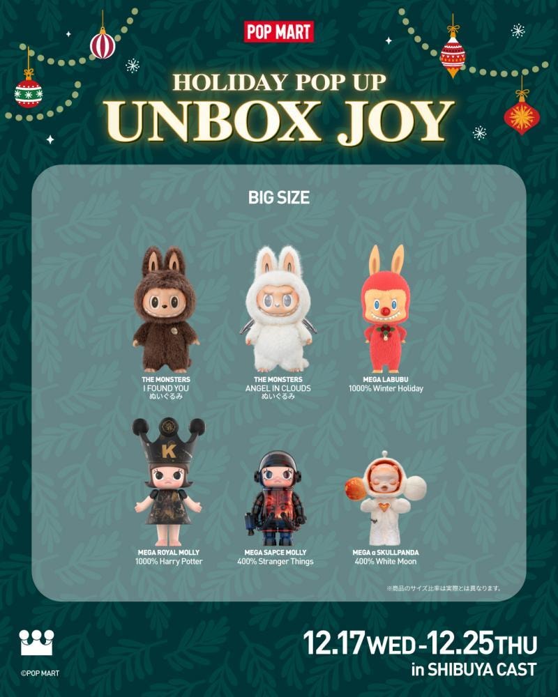 中国初のアートトイブランド「POP MART(ポップマート)」は、2025年12月17日から25日まで、「UNBOX JOY」と題したホリデーイベントを東京・渋谷キャストにて開催します。人気のLABUBU(ラブブ)のぬいぐるみの販売もあります。