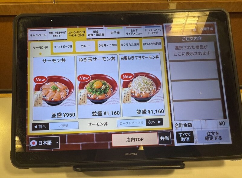 午前9時より発売とのアナウンスがあったので、大阪の某店に9時ちょっと過ぎに赴き、早速食べよう……と思ったものの。オーダー用のタッチパネルにサーモン丼が出てこない。店員に尋ねたところ「まだ販売していません」と言われる。