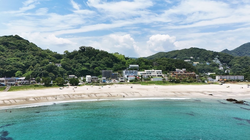 伊豆下田駅からバスで約10分。入田のバス停で降り、徒歩で海岸に向かって約5分。そこには、東京から近い場所にあるとは思えない、美しい海と砂浜、グルメが待っている。入田浜は小さめのビーチでありながら、サマーシーズンでも人が多すぎず、穏やかな雰囲気のなかで海を楽しめる。