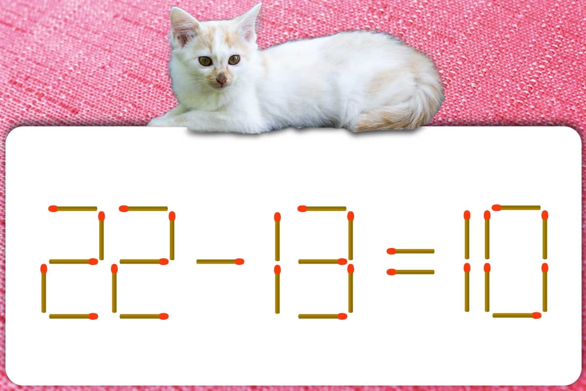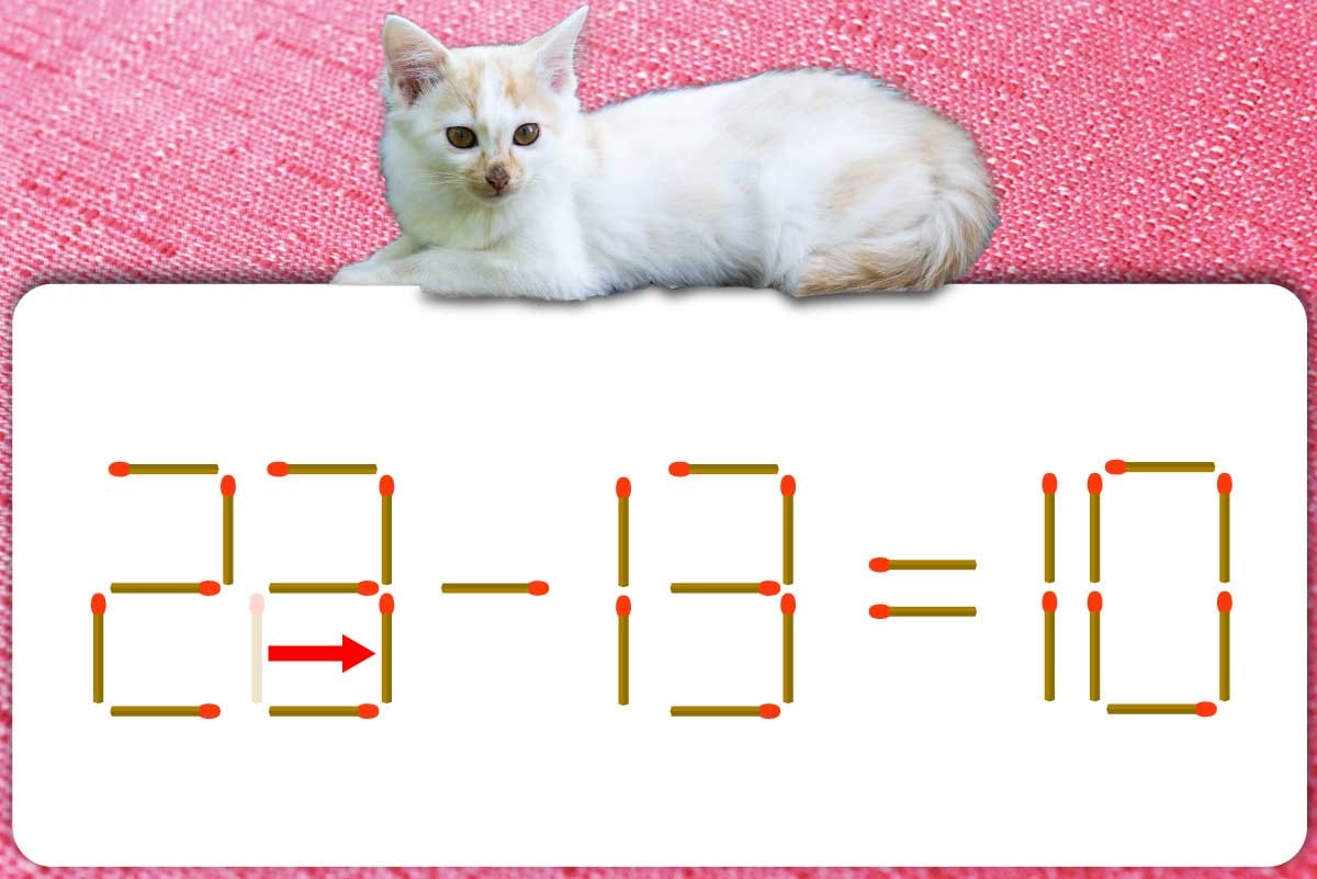 「2」のマッチ棒を1本移動させて「3」を作り「23-13=10」にする。※解答は複数ある場合があります。