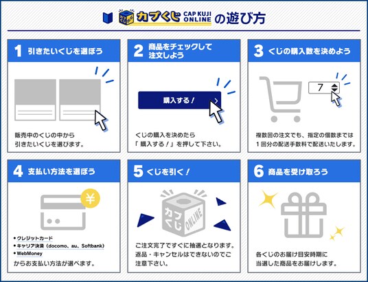 「カプくじオンライン」は、スマホ・PC等のWEBサイトからご利用いただける、「手軽に」「ハズレ無しで」「特別な商品が」「ご自宅まで直接届く」ハズレなしのオンラインくじサービスです! カプコン限定の商品やオリジナルグッズなど、様々な企画をお届けいたします!