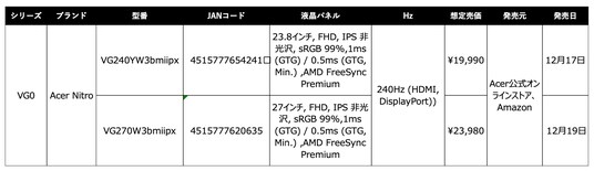 発売日は、「VG240YW3bmiipx」が本日 12月17日、「VG270W3bmiipx」が 12月19日 です。