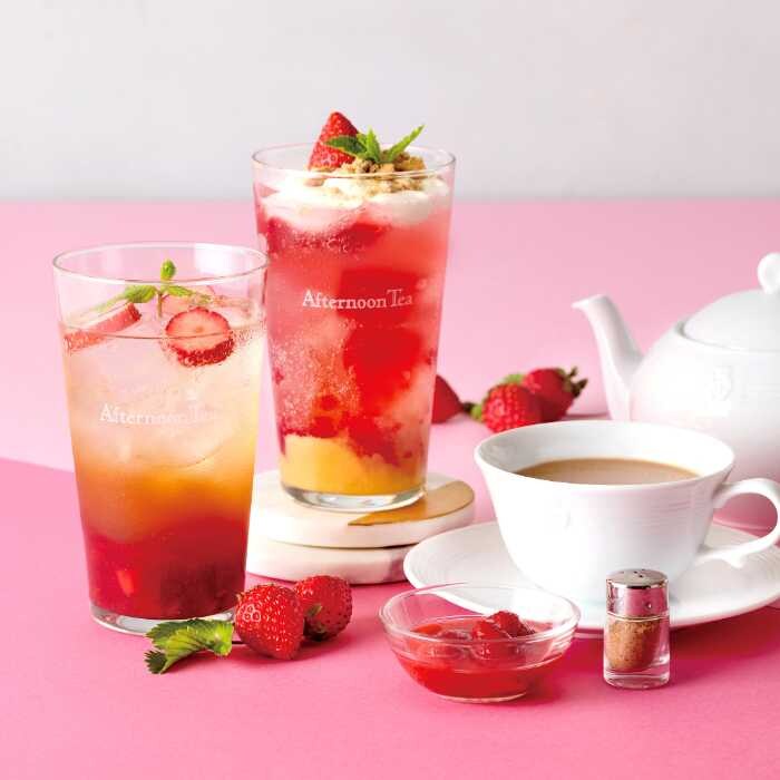 苺がふんだんに使われた冬限定ティードリンクも登場します。爽やかな「フルーツエードティー ストロベリースパークリング」は、微炭酸のダージリンティーと苺を合わせた、爽快な味わい。