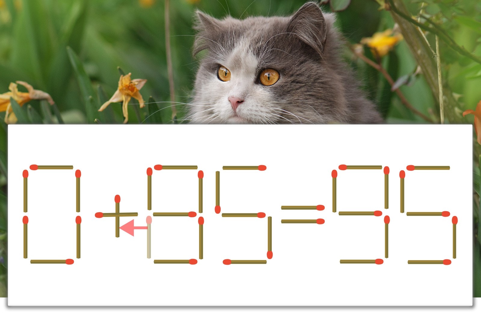 「8」を別の数字に変化させると答えが導き出せます。「8」のマッチ棒を1本移動して、「-」を「+」にしてみましょう。すると、「0+95=95」が成立します。