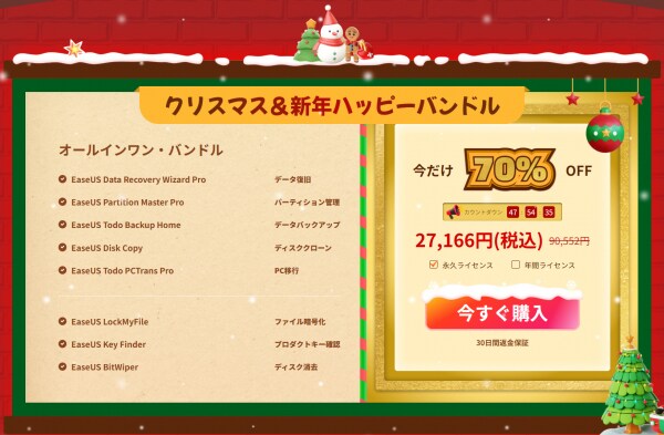 データ復旧ソフト「EaseUS Data Recovery Wizard」、パーティション管理ソフト「EaseUS Partition Master」、データバックアップソフト「EaseUS Todo Backup Home」、ディスククローンソフト「EaseUS Disk Copy」、PC移行ソフト「EaseUS Todo PCTrans」のオールインワンセットが、本限定セールで70%OFFにてご提供します。