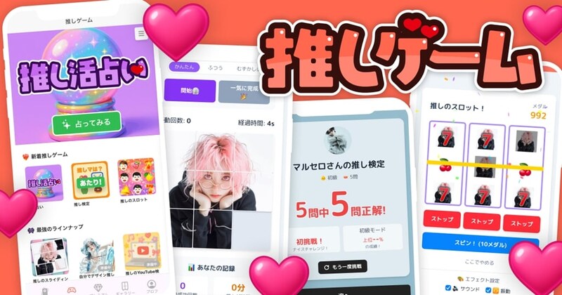 推し活を楽しむユーザーがカジュアルゲームや占いなど、さまざまなオリジナルコンテンツを作って友達と盛り上がれるウェブサービスが登場した。その名も、『推しゲーム』! ウェブサイトへアクセスすることで、ログインなしでプレイできるという。