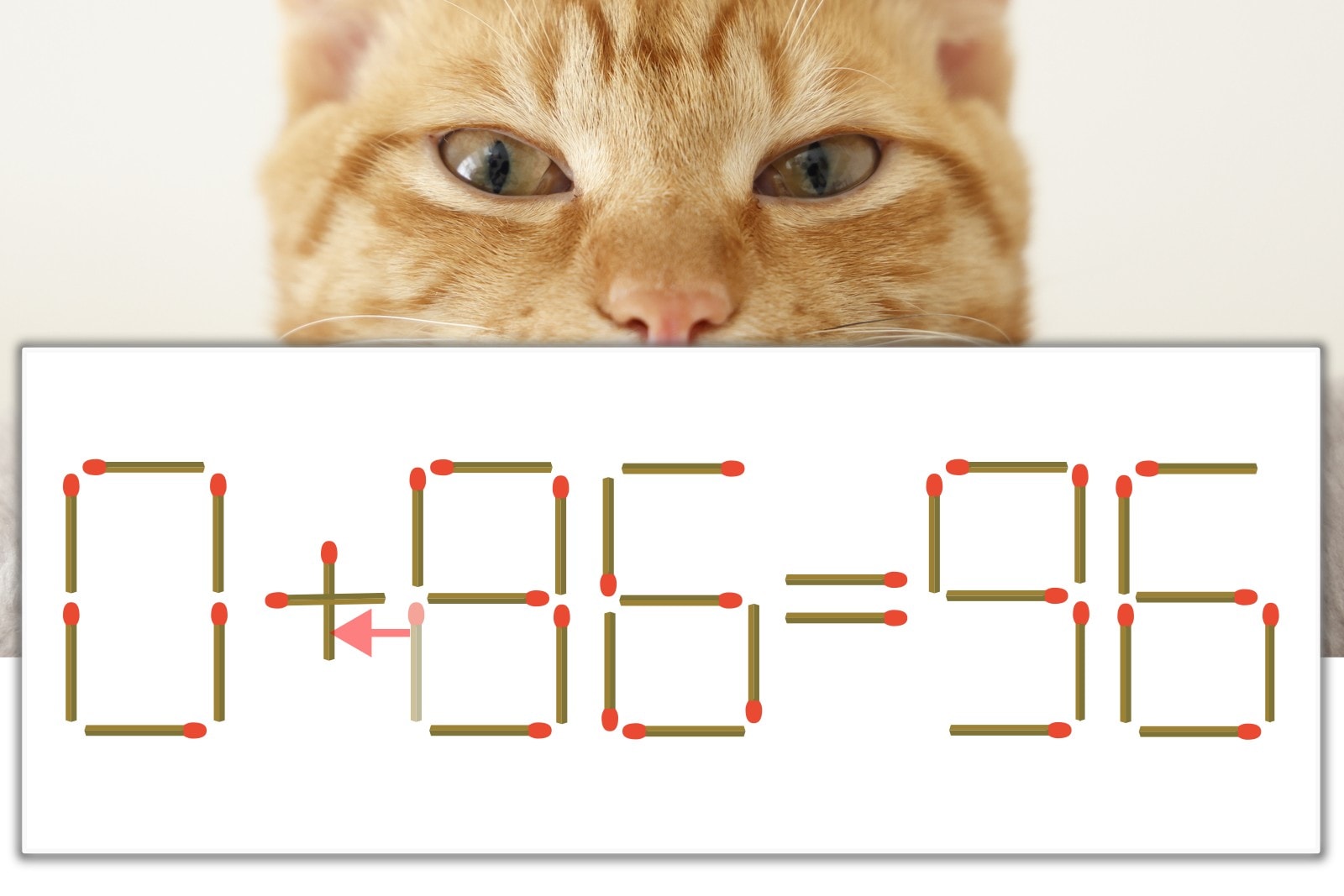 「8」を別の数字に変化させると答えが導き出せます。「8」のマッチ棒を1本移動して、「-」を「+」にしてみましょう。すると、「0+96=96」が成立します。