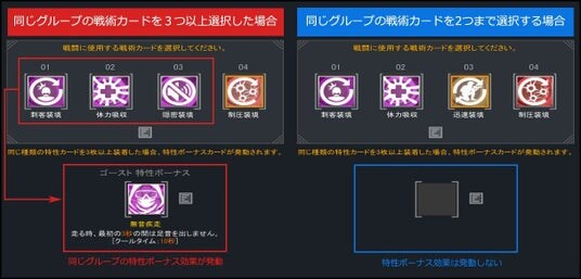 各カードは4つの特性グループ「ブリーチャー」「ゴースト」「アンカー」「スカウト」に分類されており、同一グループのカードを3枚以上装着することで「特性ボーナス」が発動します。これにより、制圧・奇襲・防衛・偵察など、プレイヤーごとの戦術的な選択がより明確になります。