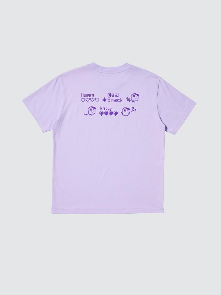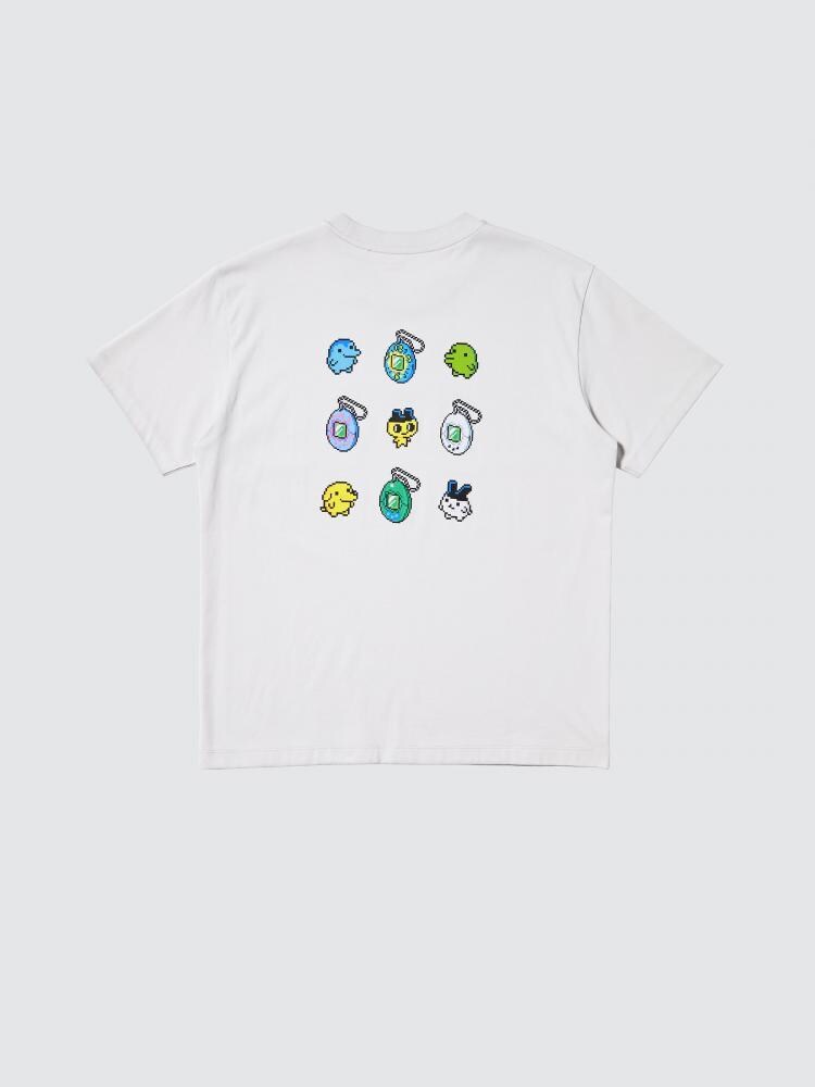 胸元にはシンプルにたまごっちロゴをデザインし、背面にはドット調のカラフルなたまごっちたちが集合しています。