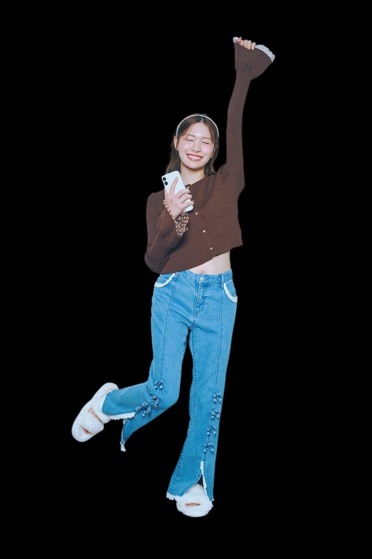 落ち着きブラウンのニットカーデで、大人っぽさをひとさじ♡ デニムのリボン&レースを引き立てて、シンプルなのにちゃんと可愛いバランスに。