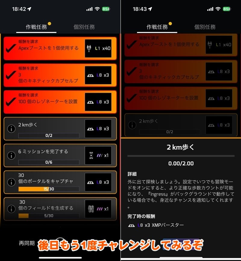 そこで最寄りのエリアでできる範囲のタスクに挑戦してみたのだけどなぜか“2Km歩く”がまったく進まない。