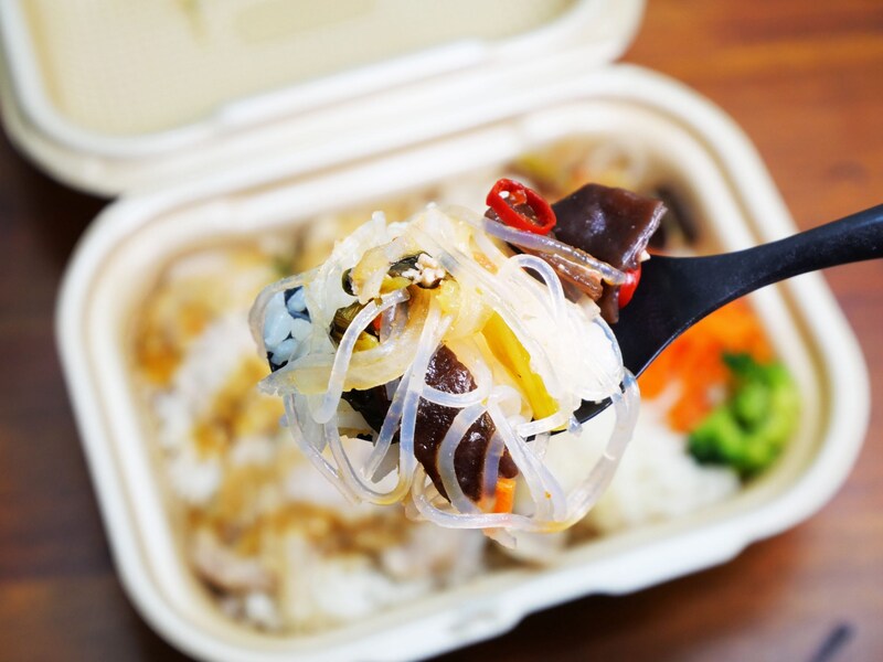 このカオマンガイの素晴らしい点はいくつもありますが、開封した瞬間の薫りが、タイの風景が思い浮かぶほど、本場のカオマンガイと同様の薫りなのです。そして、ぎっしりと敷き詰められたジャスミンライスとチキン。添えてある春雨と人参も異国の雰囲気を感じさせてくれます。