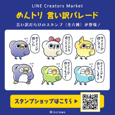 今後もLINEスタンプだけでなく、LINE着せかえやLINE絵文字に加え、「カワセル」及び「カワセルくじ」や「インクルーズプリント」でのフィジカルグッズ化など幅広く展開しますので、「面倒だがトリあえず返信」から生まれた株式会社インクルーズのオリジナルIPでもある「めんトリ」をトリあえず応援の程、宜しくお願い致します。