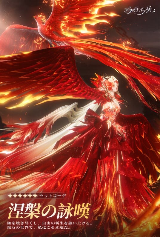 炎の中より蘇る不死鳥の衣は、拘束の闇を破り開花する枯枝の花。利便性を追求した新機能から全員参加型の創作イベントまで、視覚的な迫力、深い感情共鳴、そして多様なゲーム要素を融合した、時代を先駆けるファッションの祭典が今開かれる。今回のイベントでは皆様を涅槃の世界へとご招待いたします。灰の中より永遠を創造し、己の個性を表現してみてください。消えない炎のように、希望もまた決して絶えることはありません。