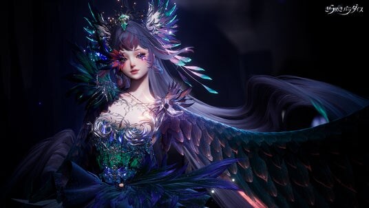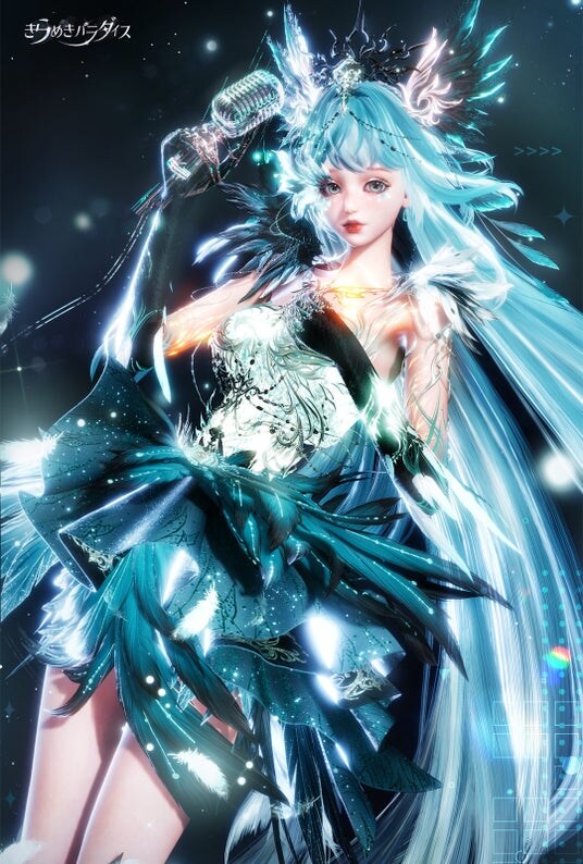 髪型には羽毛と髪を掛け合わせた二重素材を採用し、鳥類の羽毛の重なり構造を精緻に模倣。髪先には光の流れを再現した特殊エフェクトを施し、幻想的かつ繊細な質感を実現しています。