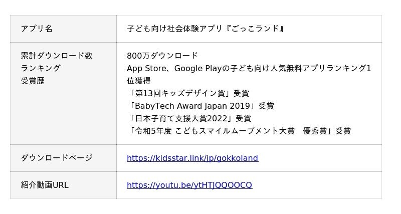 「ごっこランド」は、実在する企業のお仕事の"ごっこ遊び"をしながら社会のしくみを学べる、子ども向けの社会体験アプリです。 親しみやすい100種類以上のお仕事体験コンテンツを、子どもの目線で自社開発、配信しています。いつでも、どこにいても、無料で楽しめる"ごっこ遊び"は年間で2億回以上プレイされ、アプリの累計ダウンロード数は、800万を突破しています。 さらに2024年7月より「ごっこランド」の世界観をリアルに再現したスペシャルイベント「ごっこランドEXPO」を大型商業施設等で開催しています。