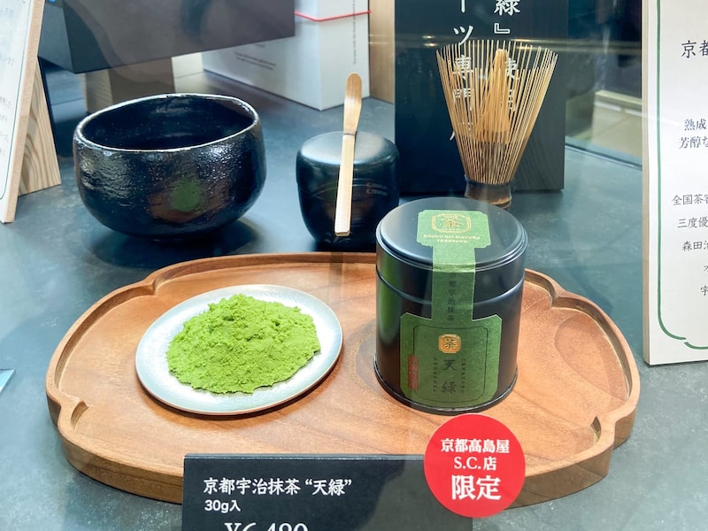 「茶久利」の世界観を象徴するのが、熟成した一番茶のみを石臼で挽いたオリジナル宇治抹茶「天緑」。力強い香りと深いコクが特徴で、京都高島屋限定で販売。抹茶好きへのギフトにもおすすめです。