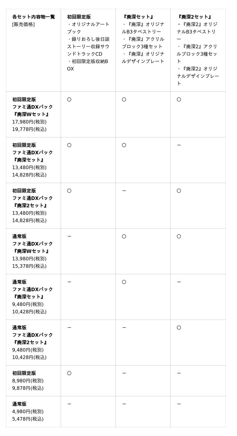 ゲームソフトに『廃深』『廃深2』それぞれの限定アイテムが付属するセットです。メインビジュアルが大きく描かれたB3タペストリーや、物陰で息をひそめるヒロインたちがデザインされたアクリルブロックなどシリーズのビジュアルが多数盛り込まれた豪華グッズセットをお見逃しなく! 各ナンバリングのグッズが手に入る『廃深セット』『廃深2セット』の他、両タイトルのグッズが一挙に手に入る『ファミ通DXパック廃深Wセット』もご用意しております。