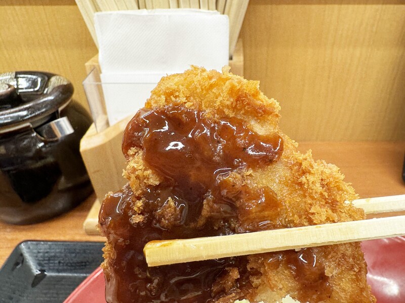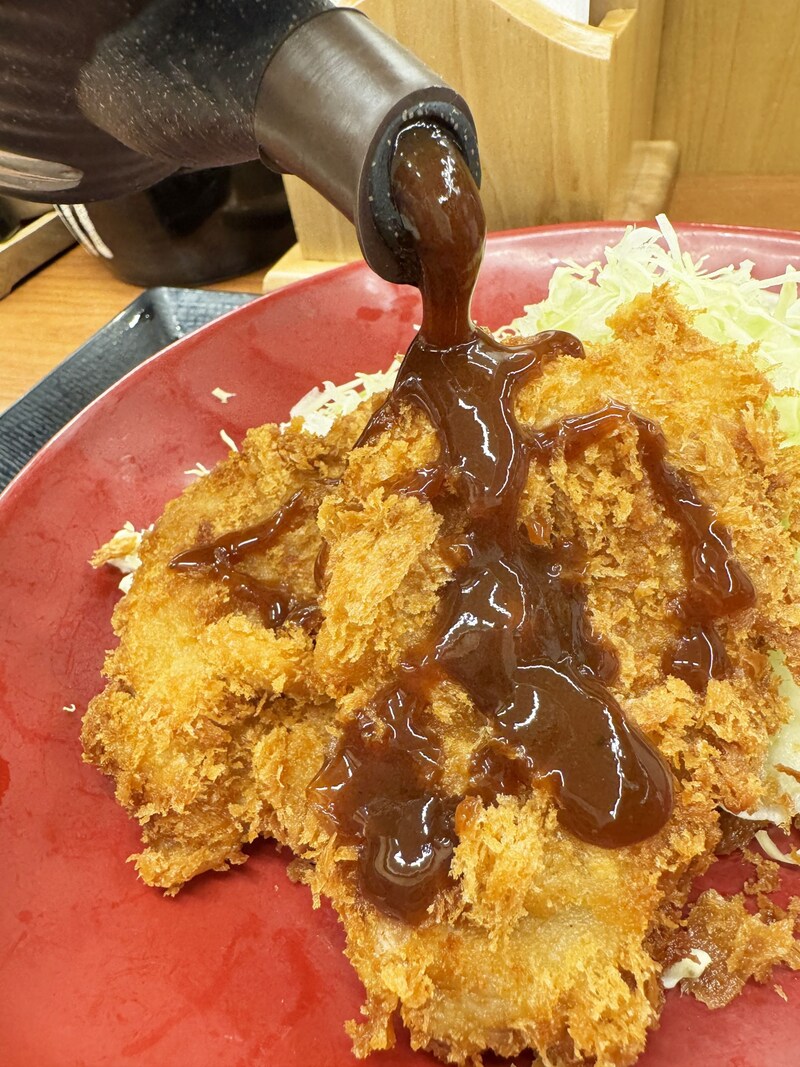 目の前にやってきたヒレカツ定食。カラッとザクザクに揚げられたヒレカツが目視で魅惑的。そこに添えられた豚汁は、大サイズにしたのでお椀が大きい。まずはヒレカツを食べる。かつやのとんかつをおいしく食べる最適解はソースだと思っているので、たっぷりとソースをかける。