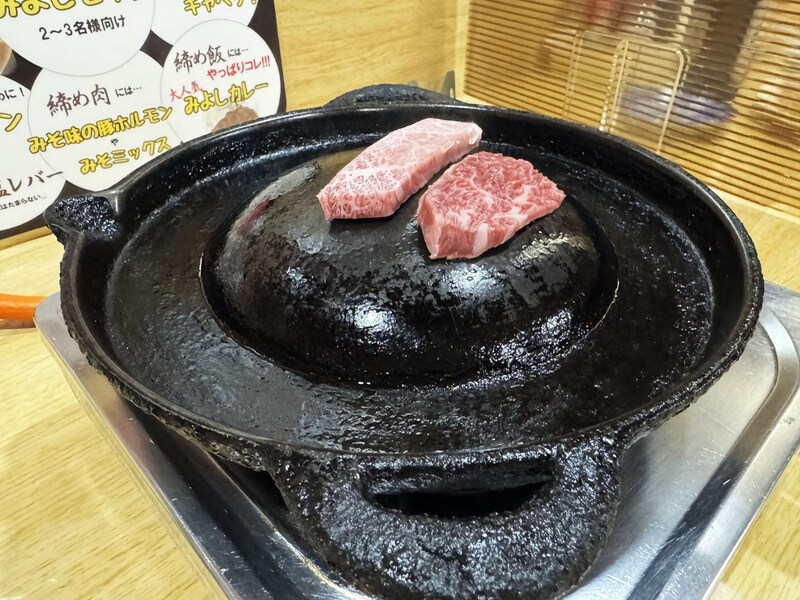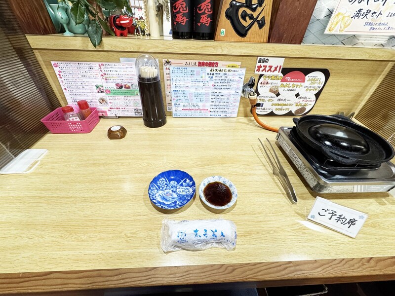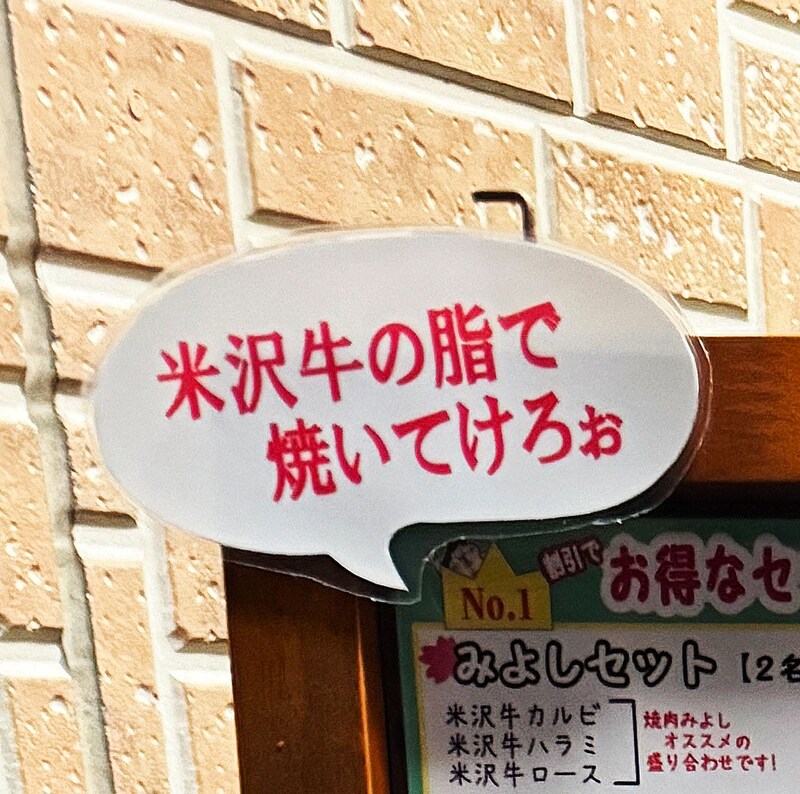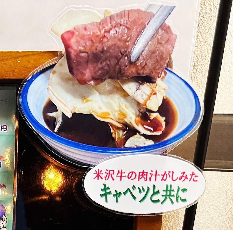 そしてなにより心が躍る一文がメニューに書かれていた。「米沢牛の脂で焼いてけろぉ」「米沢牛の肉汁がしみたキャベツと共に」と! これは期待せずにはいられない。米沢牛を米沢牛の脂で焼くってコト!? あぁ、なんと幸せな展開。ということで、孤独の一人焼肉グルメを体験するべく入店した。