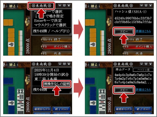 手順(1)で記録したハッシュ値と一致していれば、牌山データは局の開始時と終了後で変わっておらず、牌操作はないことが証明されます。