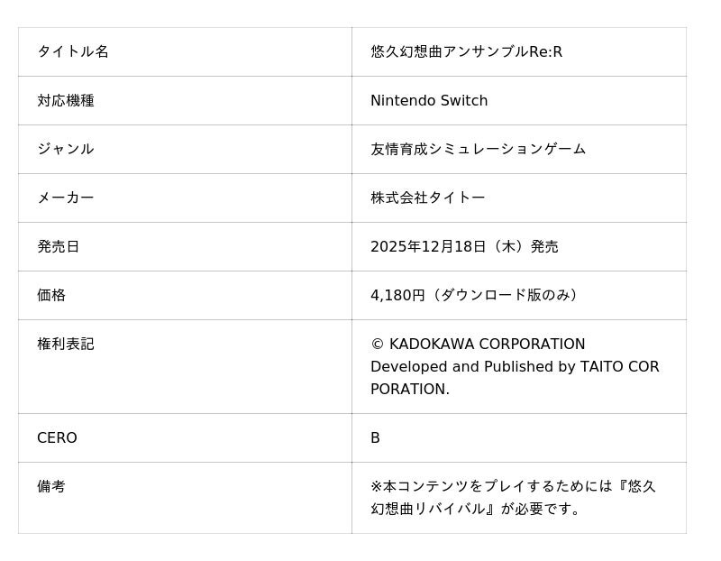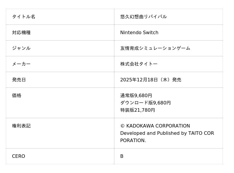 株式会社タイトー(本社:東京都新宿区、以下タイトー)は、Nintendo Switch(TM)用ソフト『悠久幻想曲リバイバル』を本日発売いたしました。発売を記念して、ダウンロード版『悠久幻想曲リバイバル』を12月31日(水)まで10%オフでお買い求めいただけるほか、Amazonギフトカードが当たる「『悠久幻想曲リバイバル』発売記念キャンペーン」を、X(旧Twitter)にて実施します。
