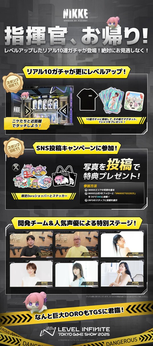 会場内の「NIKKE」展示を撮影し、公式Xアカウントをフォローして「#NIKKETGS2025」を付けて投稿すると、限定Doroショッパーとステッカーやオリジナルグッズが当たるSNSキャンペーンも実施。思い出の一枚をシェアしながら、特典獲得のチャンスをお見逃しなく。
