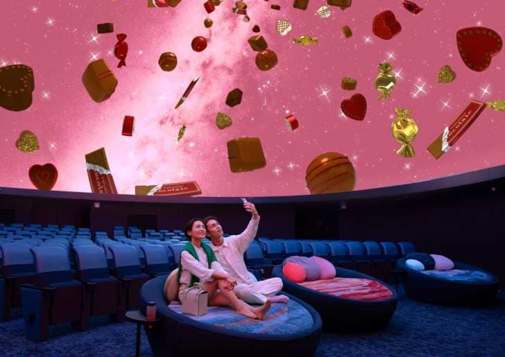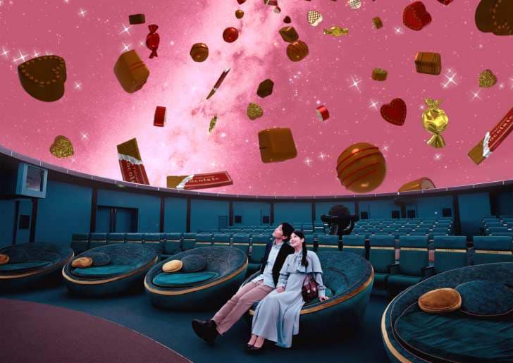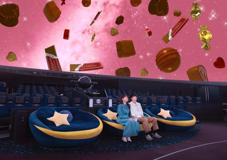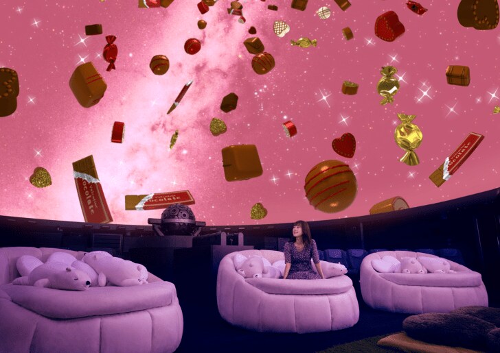 「ウェルカムドーム」は、プラネタリウム本編上映前の待ち時間に上映される映像プログラム。「バレンタインウェルカムドーム」では、プラネタリウム本編上映前の約5~10分間に、ピンク色の星空にチョコレートがふわふわと浮かぶ、バレンタイン限定の特別映像を上映。バレンタインデートにもぴったりな、甘くとろけるようなひとときを過ごすことができる。