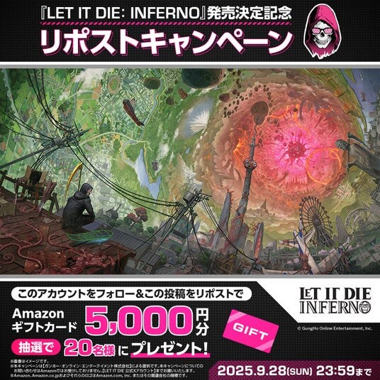 『LET IT DIE: INFERNO』の最新情報発表と予約開始を記念し、公式Xアカウントでリポストキャンペーンを実施いたします。抽選で20名様にAmazonギフトカード5,000円分が当たります。