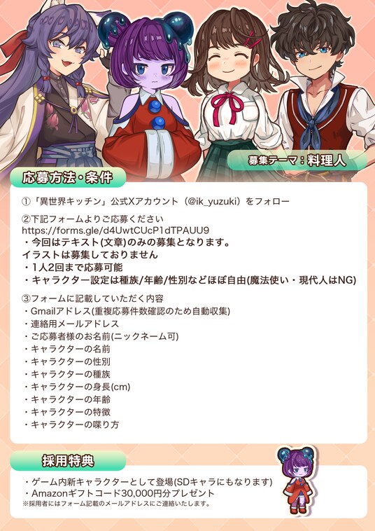 素晴らしいキャラクターコンセプトをご提案いただいた場合でも、異世界キッチンの世界観やゲーム運営上の都合により、 設定の一部を調整・改変したうえで採用させていただくことがございます。