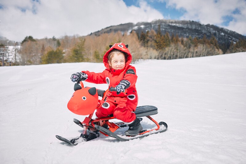 子どもがスキーやスノーボードに飽きてしまっても、宿泊者限定でそりや雪遊びグッズも無料でレンタルできるため、家族での雪遊びを通して雪山に親しむ体験ができる。