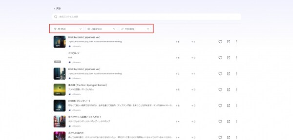 2.作品閲覧・検索機能:公開されている楽曲をジャンル・言語・新着順などで検索可能。気になる作品をすぐに見つけ、再生・お気に入り登録ができます。