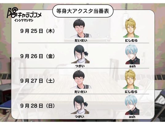 「陰キャラブコメ インシツマシマシ」の試遊台の横には、「陰キャラブコメ」ではおなじみのオタクたちが日替わりでやって来る!