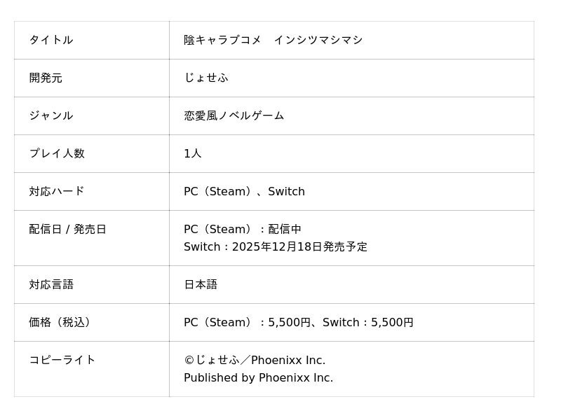 株式会社Phoenixx(フィーニックス)(東京都武蔵野市、代表取締役社長:坂本 和則)は、恋愛風ノベルゲーム『陰キャラブコメ インシツマシマシ』のNintendo Switch(TM)版が2025年12月18日(木)に発売決定したことをお知らせいたします。