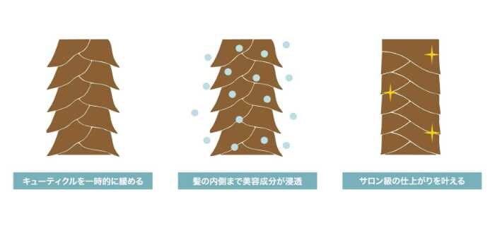 髪内部にはCMC類似成分³が潤いを届け、ダメージを集中補修。さらに、3種のフィトタンパク⁴がキューティクルを整え、湿気によるうねりを防ぎます。