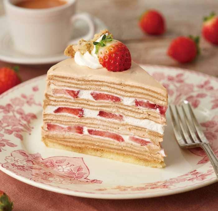 国産発酵バターとライ麦粉を使用したクレープ生地に、ディプロマットクリームと旬の苺を5層に重ねた、断面も美しい一品です。
