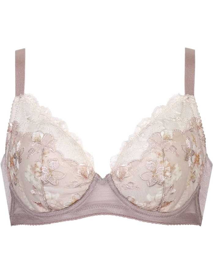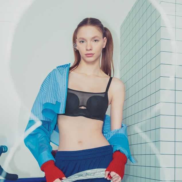 バージスライン全体に高密度不織布を使用し、ワイヤーなしでも下からバストを支えて位置をアップします。パワーネットがバストを中央に寄せて高さをおさえ、広がりにくく脇もすっきり。