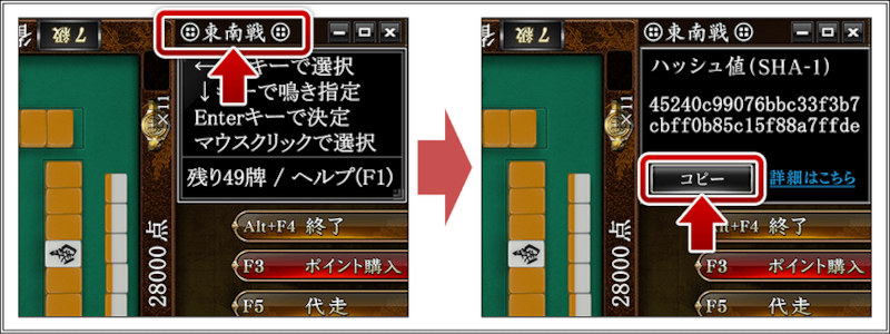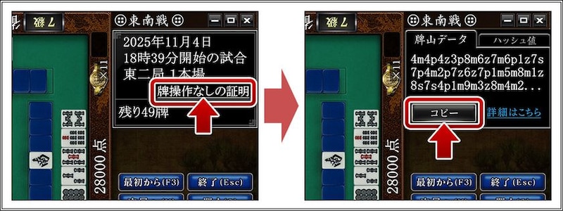手順(1)で記録したハッシュ値と一致していれば、牌山データは局の開始時と終了後で変わっておらず、牌操作はないことが証明されます。