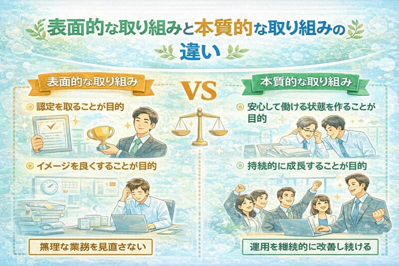 表面的な健康経営と、本質的な健康経営の違いは、「何のためにやっているか」に集約されます。