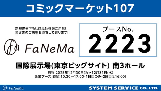 システムサービス株式会社(本社:東京都豊島区、代表取締役社長:田村宗弘)は、アニメ・マンガ・ゲーム作品等のキャラクター商品の企画・製作・販売をする自社ECサイト「FaNeMa」(URL:https://fanema.jp/)ブランドにて、2025年12月30日(火)・12月31日(水)に開催される「コミックマーケット107」に出展いたします。